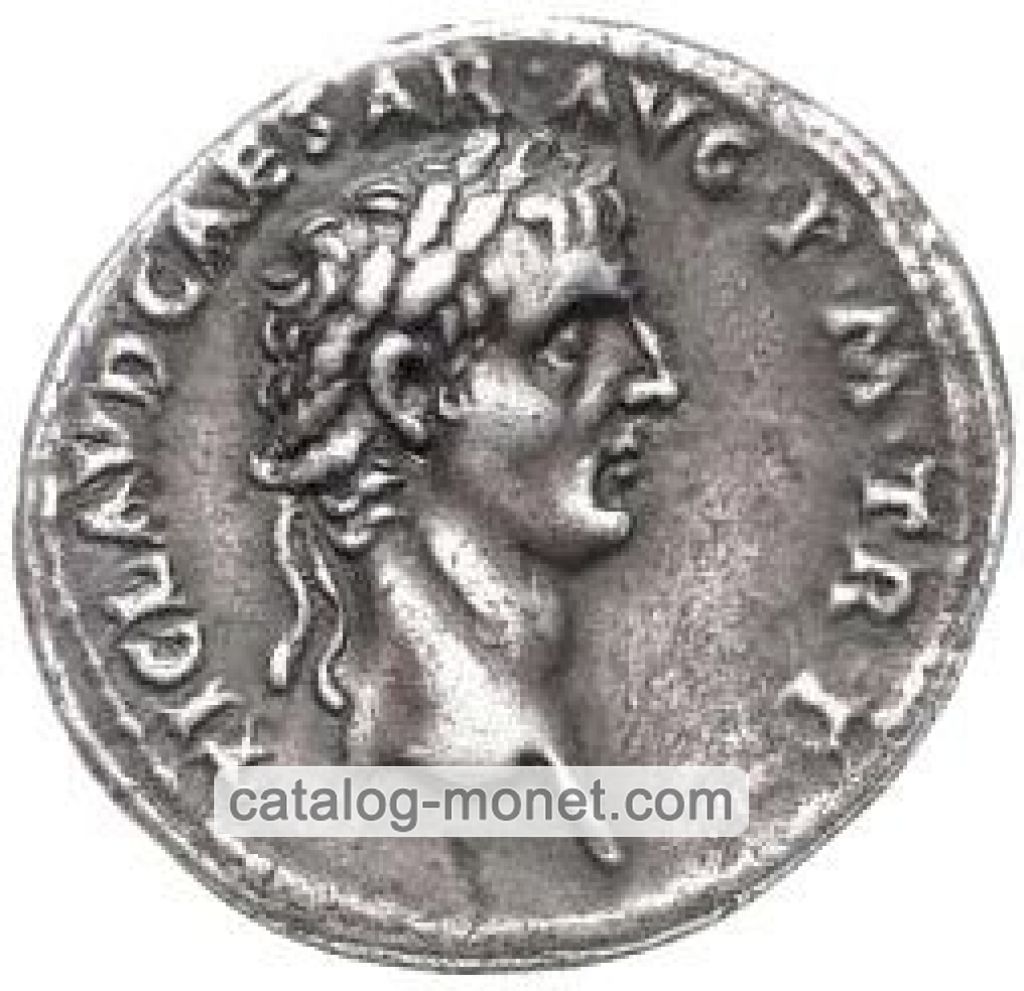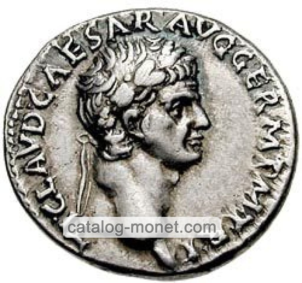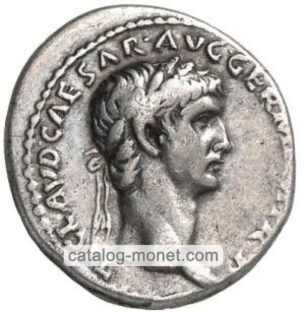 TI. CLAVD. CAESAR AVG. GERM. P. M. TRIB. POT. P. P. — голова Клавдия в лавровом венке вправо.
