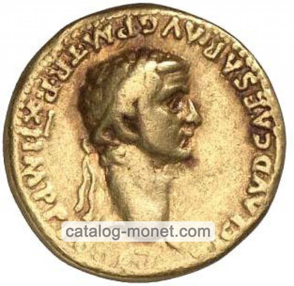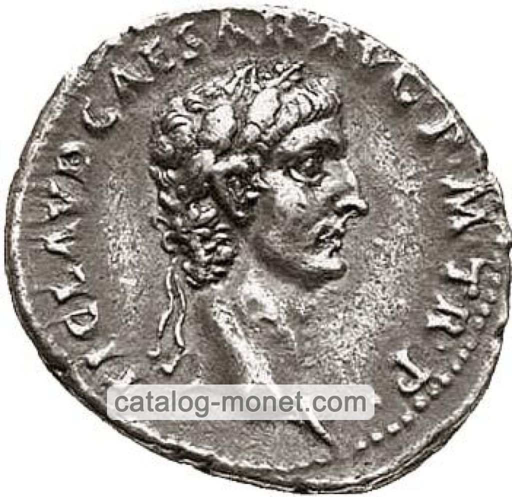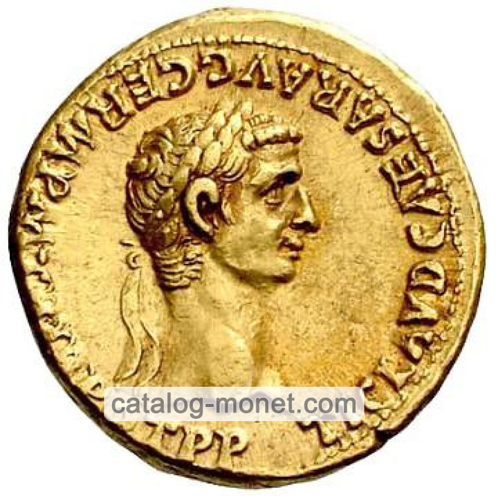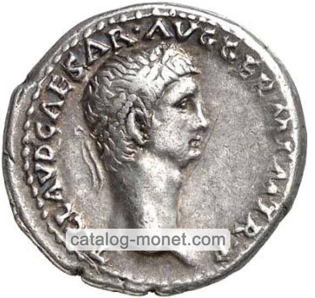 TI. CLAVD. CAESAR AVG. GERM. P. M. TRIB. POT. P. P. — голова Клавдия в лавровом венке вправо.