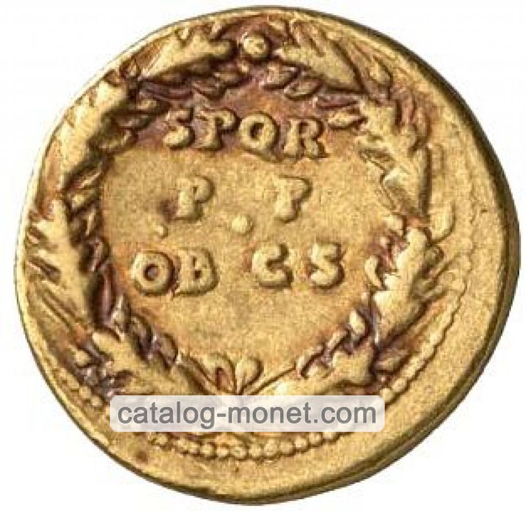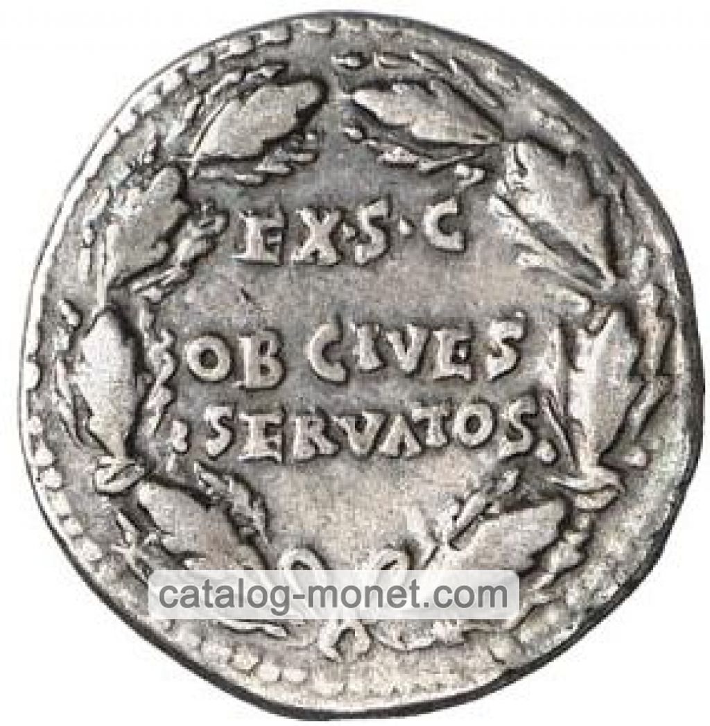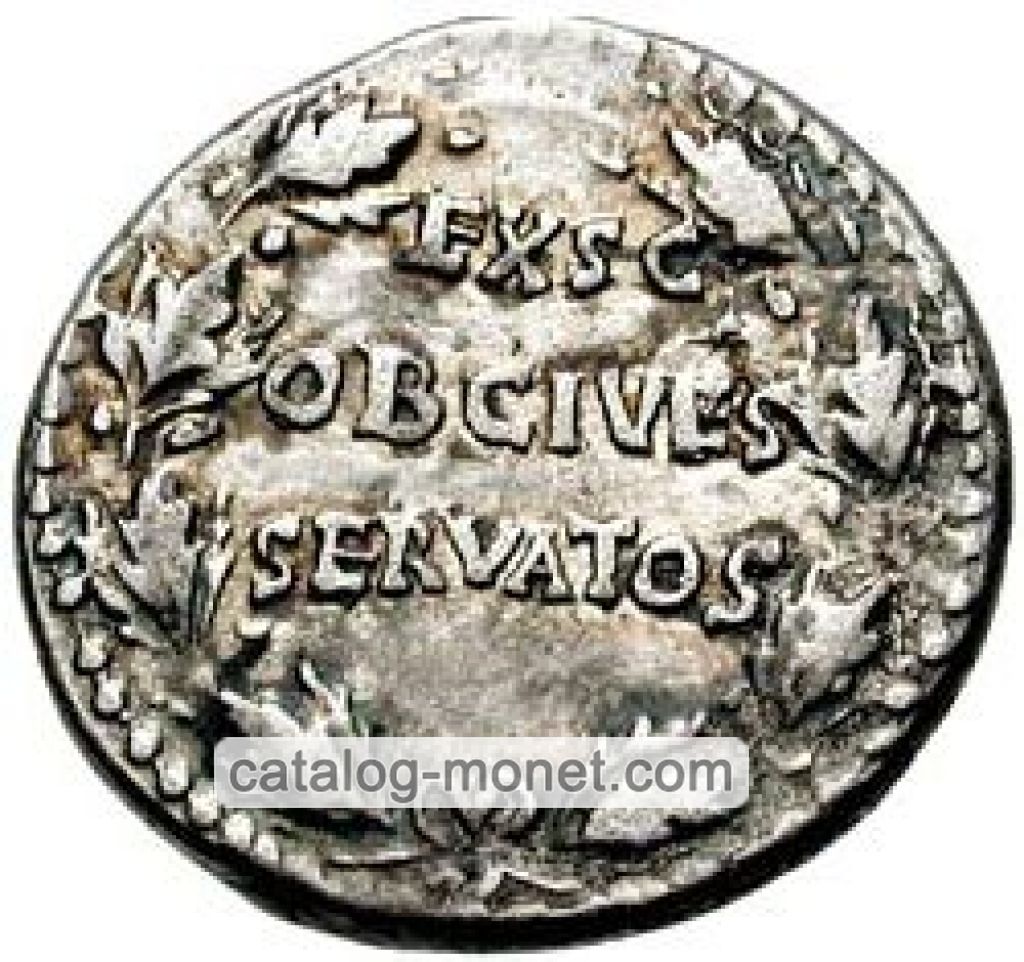 EX S. C. / OB CIVES / SERVATOS — в центре поля в три линии внутри венка из дубовых листьев.