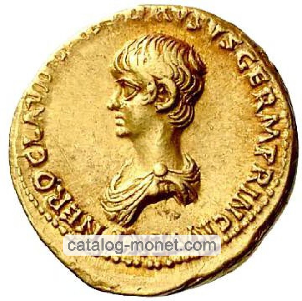 NERO CLAVD. CAES. DRVSVS GERM. PRINC. IVVENT. — драпированный бюст молодого Нерона с обнаженной головой влево.