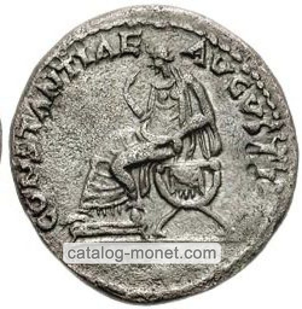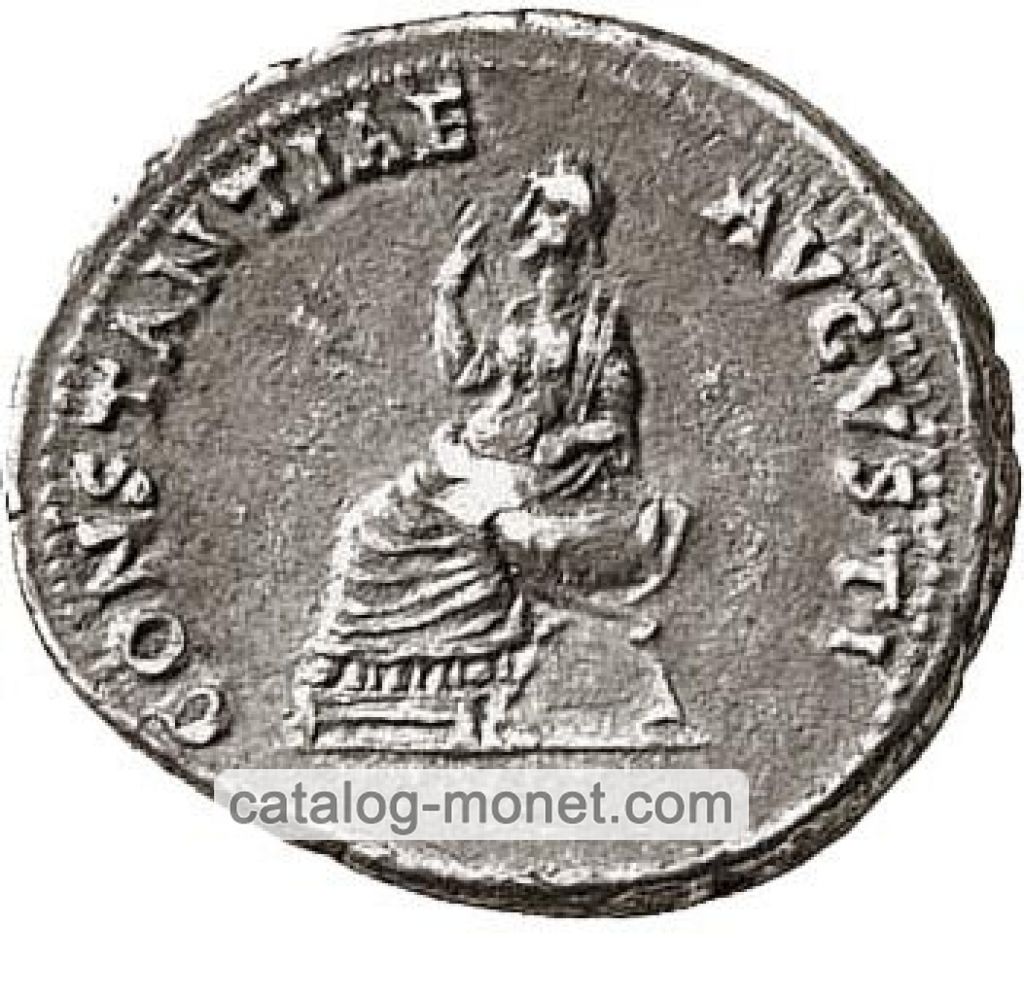 CONSTANTIAE AVGVSTI — Констанция (Верность) в драпировке сидит влево на курульном кресле ноги стоят на скамеечке для ног правая рука поднесена к лицу левая лежит на ноге.