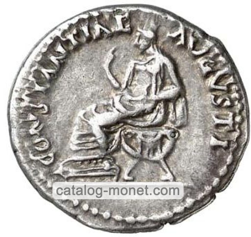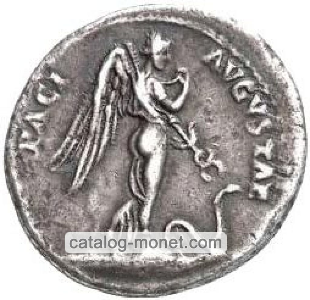 PACI AVGVSTAE — крылатая женская фигура (Немесида) в драпировке идет вправо держит в левой руке направленный вниз крылатый кадуцей перед ней ползет вправо змея; ее правая рука поднята вверх и держит край драпировки внизу шеи.