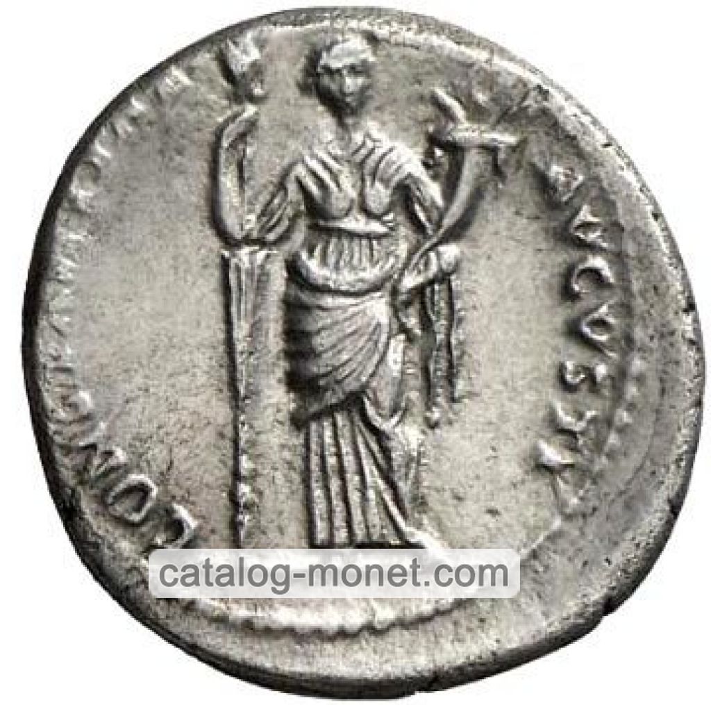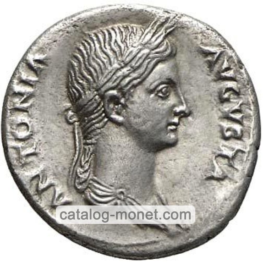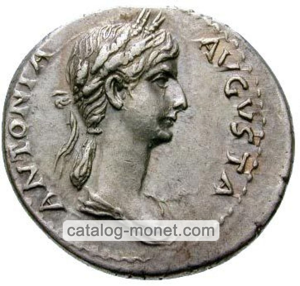 ANTONIA AVGVSTA — бюст Антонии в драпировке вправо; на голове надет венок из зерновых колосьев от которого сзади свисает длинная завязка; волосы сзади заплетены в длинную косу.