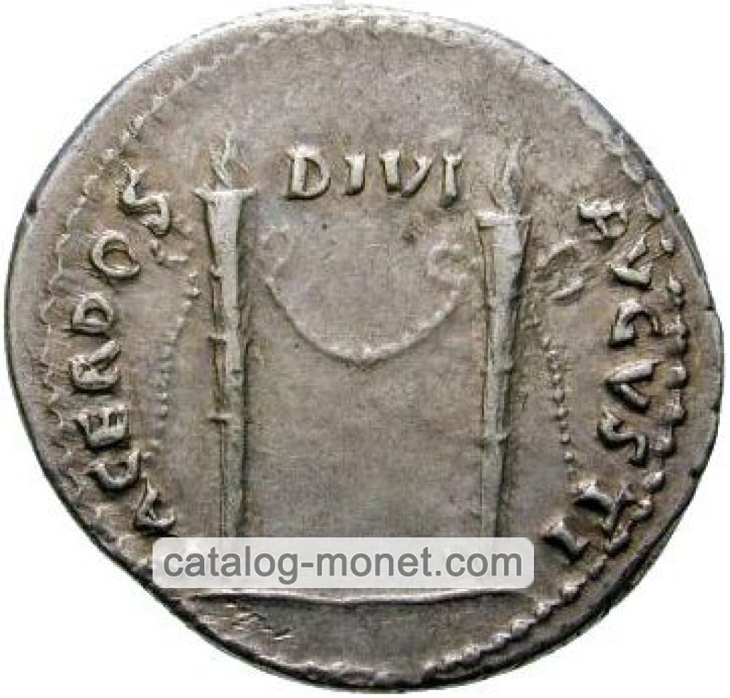 SACERDOS DIVI AVGVSTI — два горящих факела вертикально связанные сразу под огнем лентой которая провисает в середине в то время как ее концы свисают с обеих сторон.
