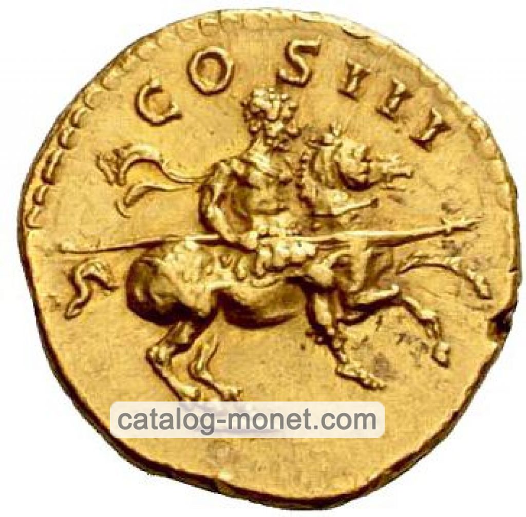 COS. III — Адриан в плаще развевающемся за его спиной на коне скачет вправо держа копье в опущенной правой руке.