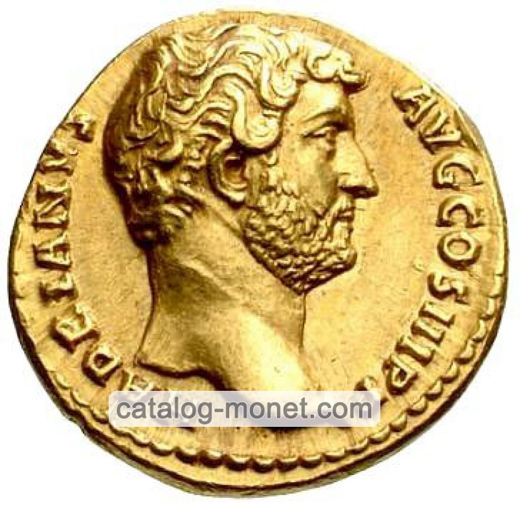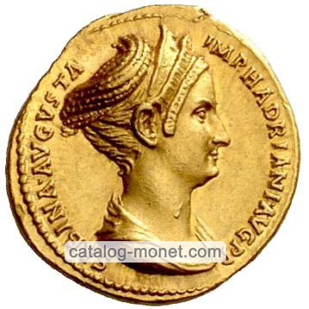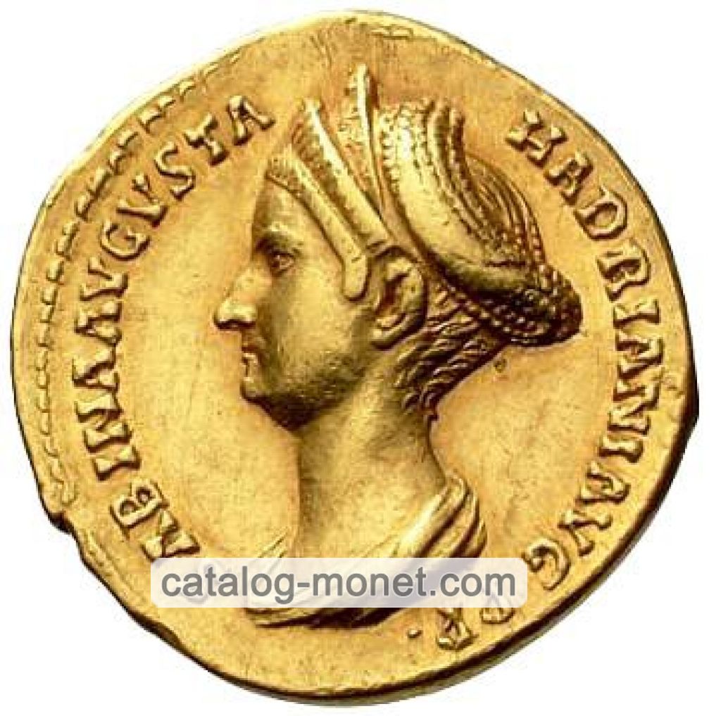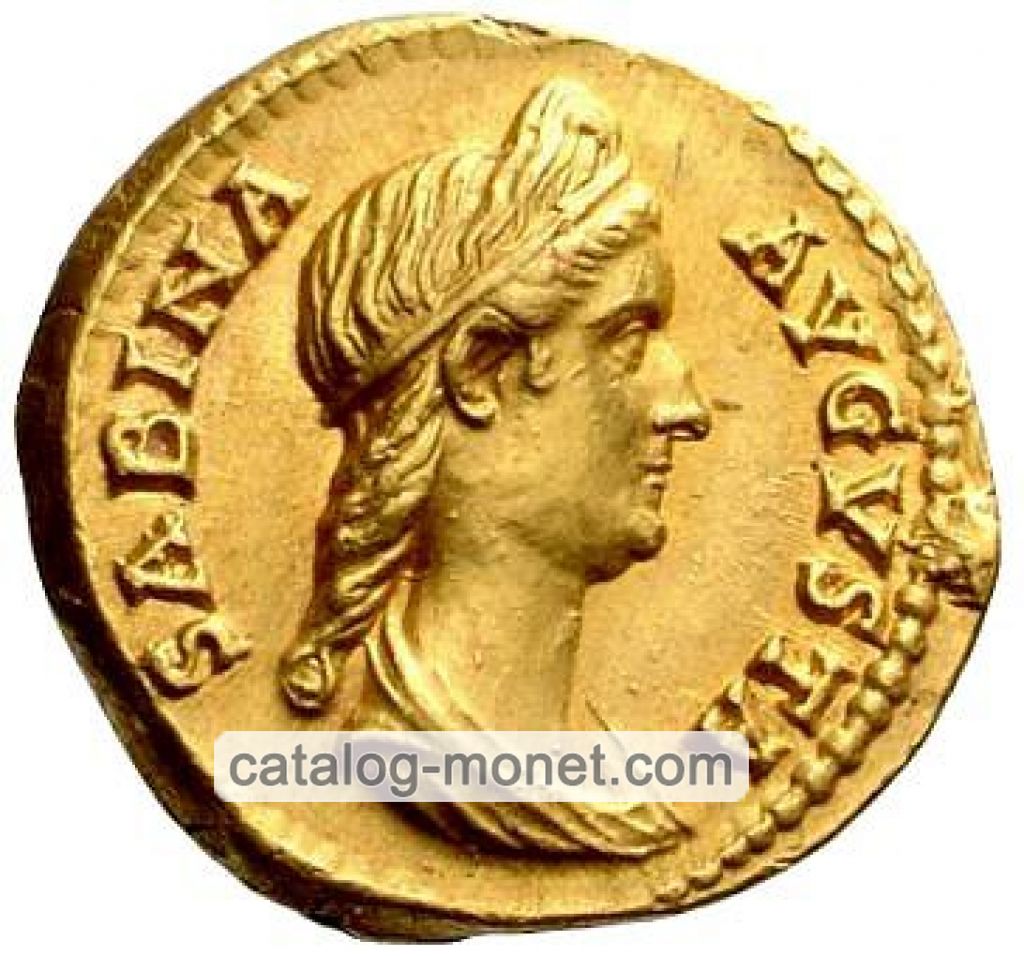 SABINA AVGVSTA HADRIANI AVG. P. P. — драпированный бюст Сабины влево без косы волосы уложены кольцами и собраны на макушке над тройной стефаной (в конце легенды — точка).