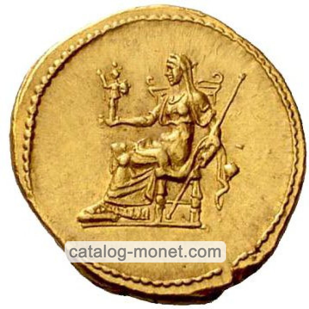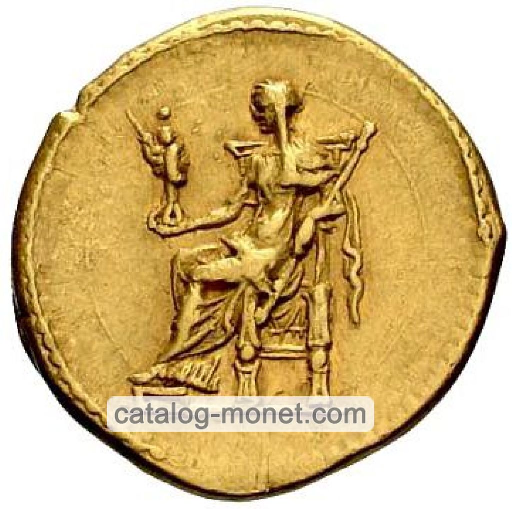 ROMA AETERNA — Рома в шлеме в драпировке сидит влево на курульном кресле держит Викторию на протянутой правой руке и вертикально поставленное копье с человеческой головой на острие — в левой.
