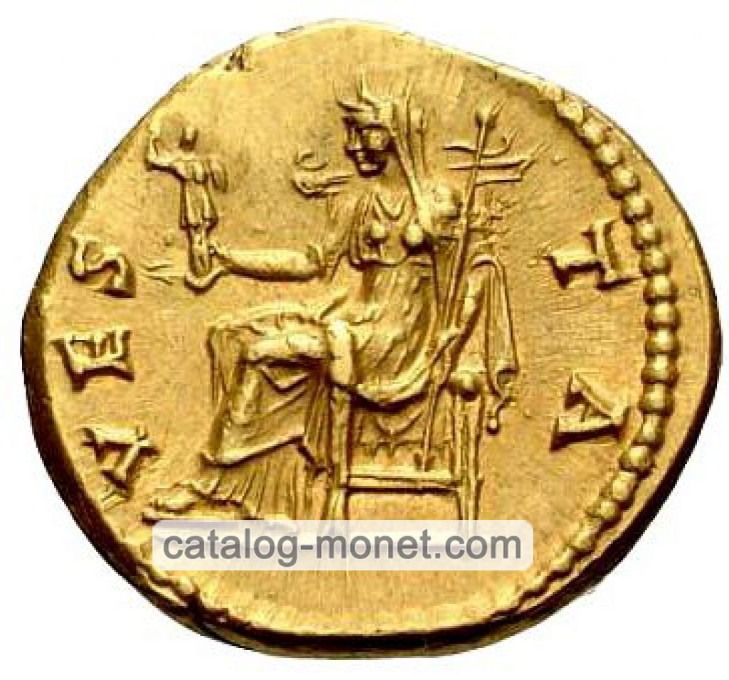 VESTA — Веста с покрытой головой в драпировке сидит на троне влево держит палладий на вытянутой правой руке и скипетр — в левой.