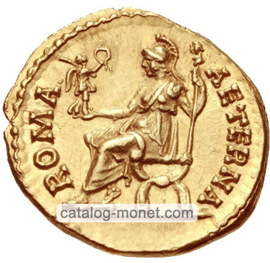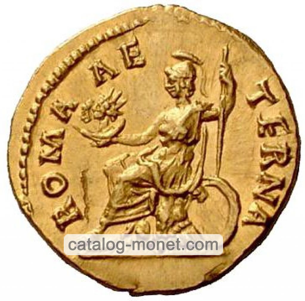 ROMA AETERNA — Рома в шлеме в драпировке сидит влево на доспехах держит головы Солнца в лучевой короне и Луны на полумесяце в правой руке и в левой — вертикально держит копье; сзади — круглый щит.