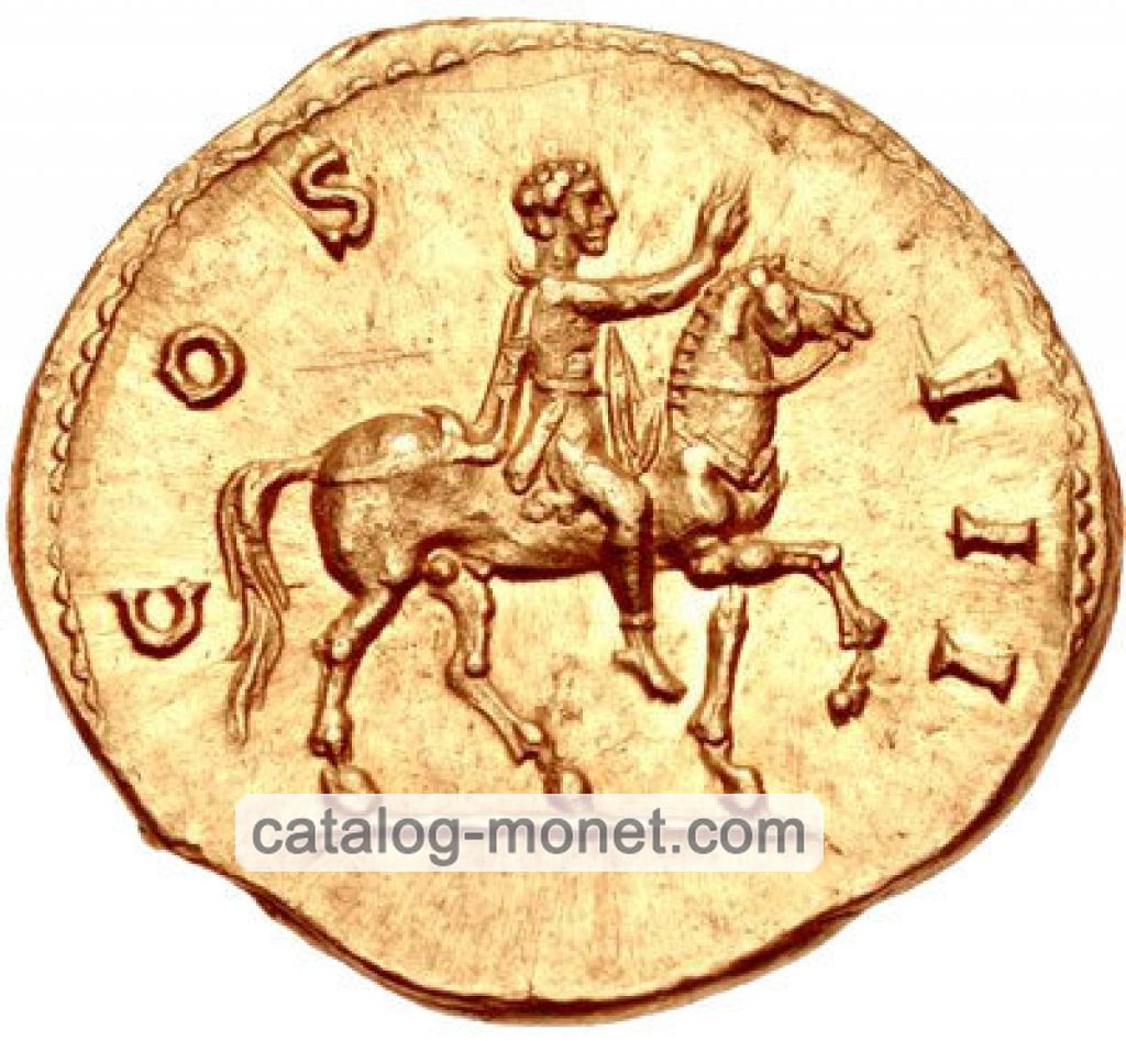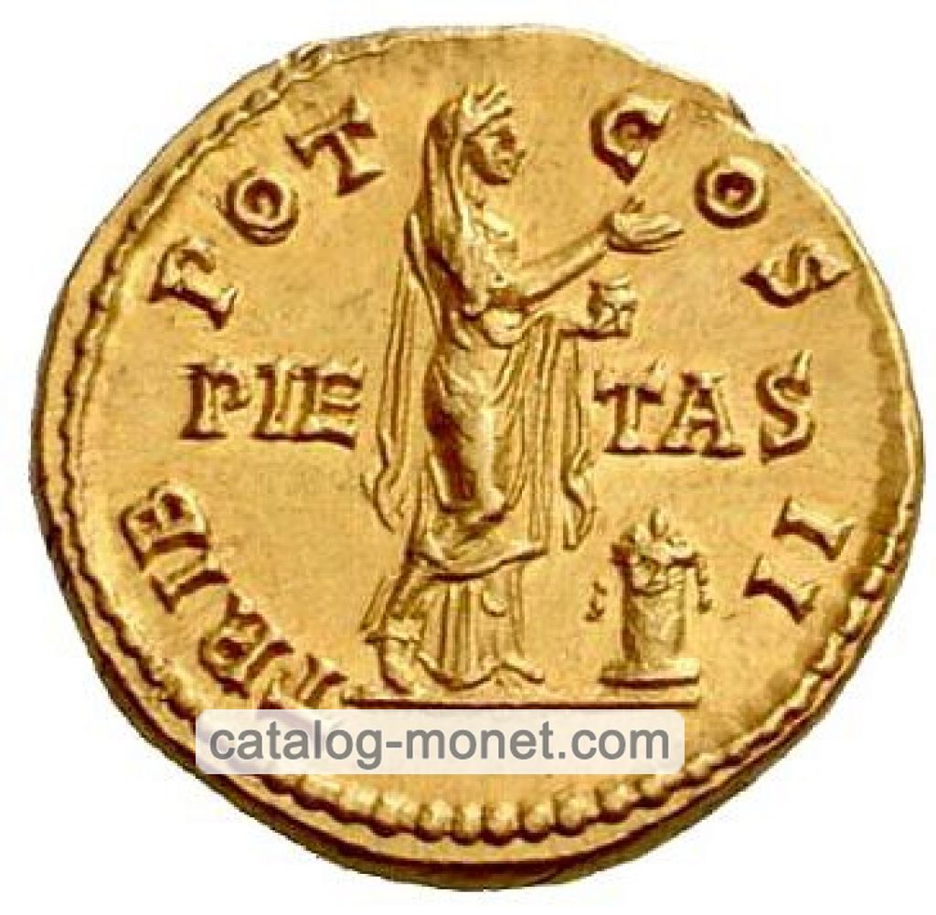TRIB. POT. COS. II — Благочестие (Pietas) с покрытой головой в драпировке стоит вправо подсыпает фимиам из правой руки над горящим алтарем справа и держит сосуд с фимиамом в левой руке. В левом и правом полях: PIETAS