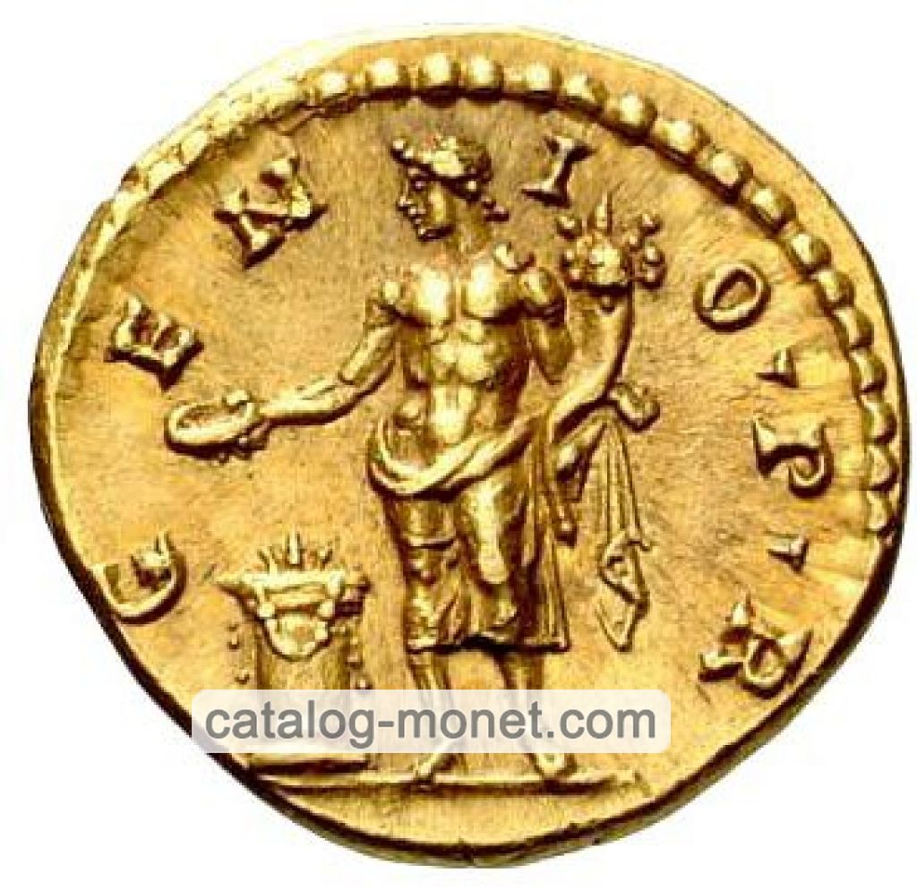 GENIO P. R. — Гений римского народа повернув голову влево стоит во фронт в левой руке держит рог изобилия в правой — патеру из которой совершает жертвенное возлияние над горящим алтарем.