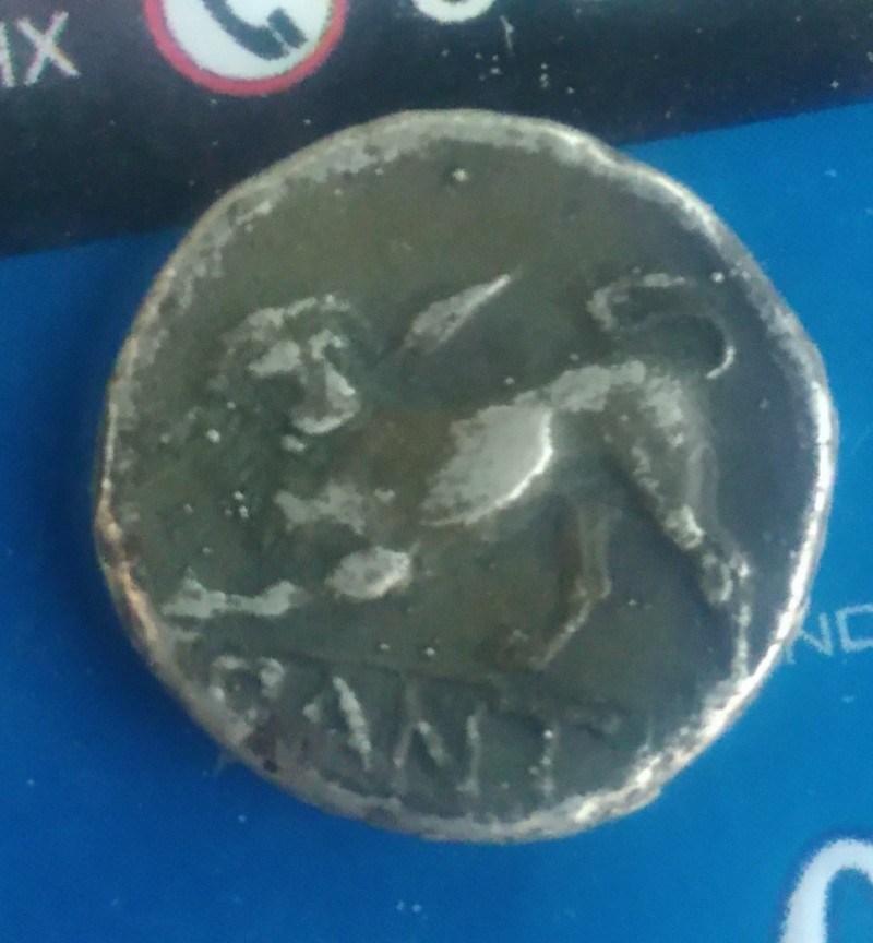 Гемидрахма Описание аверса:Голова безбородого Сатира в 3/4 влево Описание реверса:ПАNTI. Лев с копьем в пасти, влево 370-365г. до н.э.