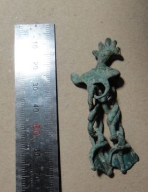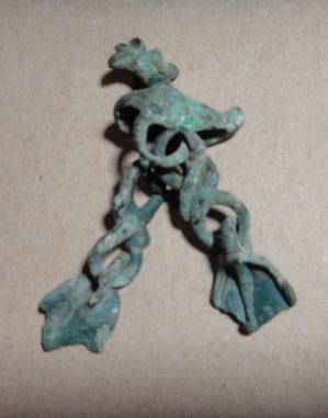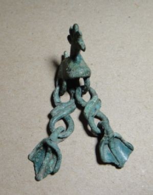 Объемная полая бронзовая подвеска в виде уточки с двумя «лапками», подвешенными на цепочках к корпусу украшения VIII-Xв. Образ утки с древних времен и до начала XX века – один из наиболее популярных в северной мифологии, связан с представлениями о возникновении мира