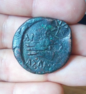 Кладовая монета, с двумя надчеканами восьмиконечной звезды.