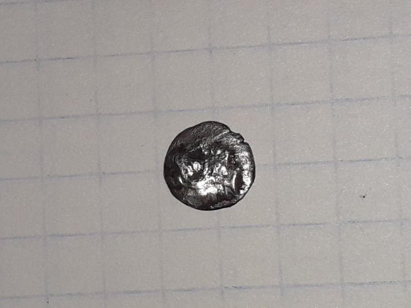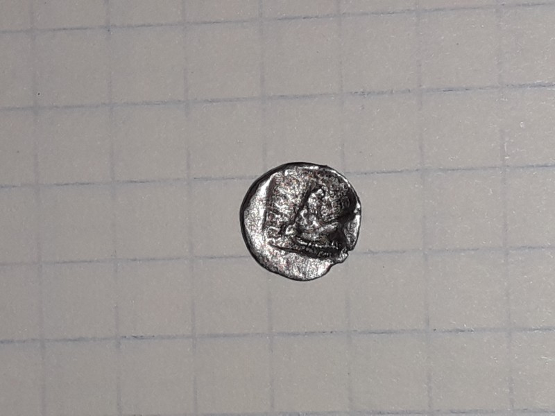 Гемиобол металл серебро, аверс голова геракла в львиной шкуре вправо.Реверс вдавленный квадрат с головой коня вправо вверху надпись синдон