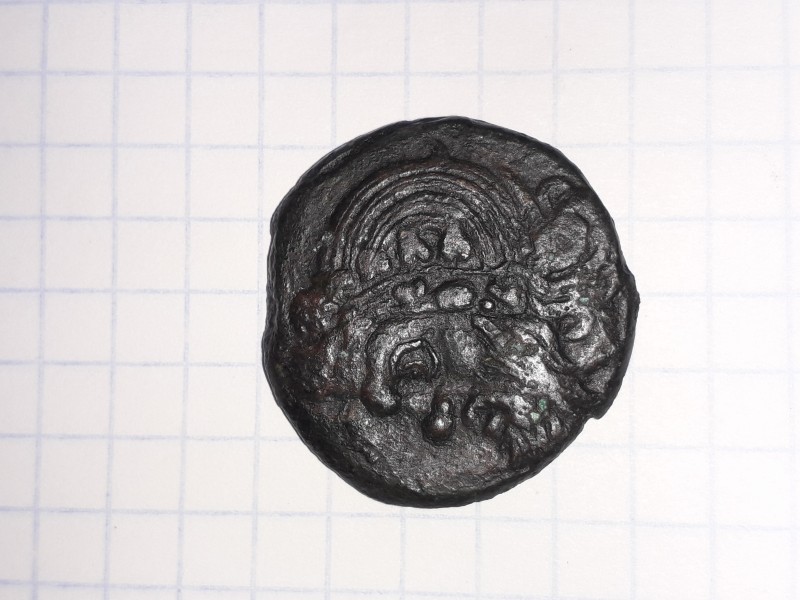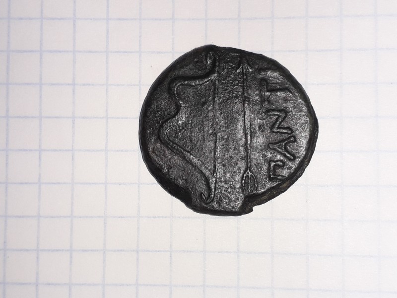 Реверс: Голова бородатого сатира в плющевом венке реверс:лук,стрела,снизу надписьПАNTI