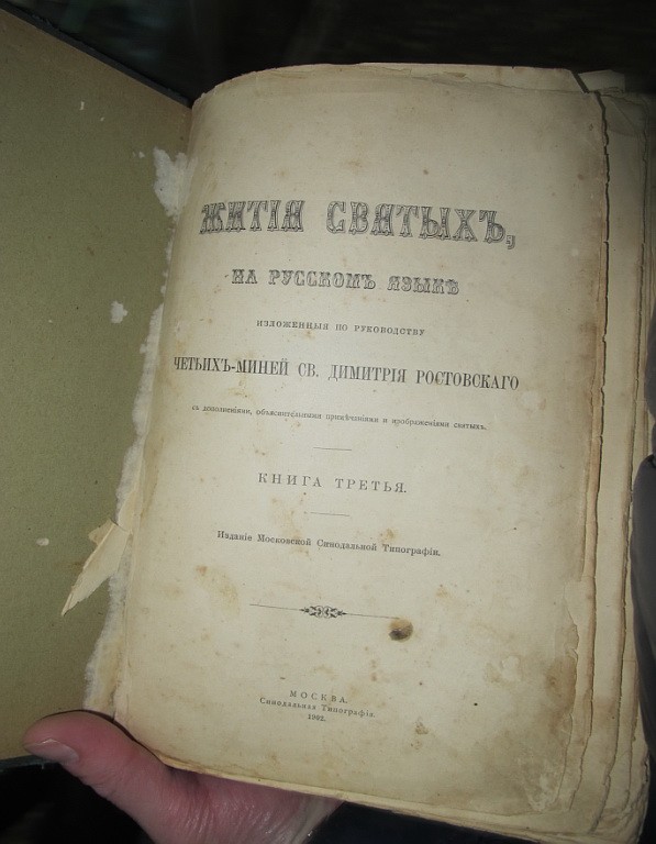 церковная книга Жития святых по руководству четьих-миней Святого Дмитрия Ростовского, Москва,1902 год