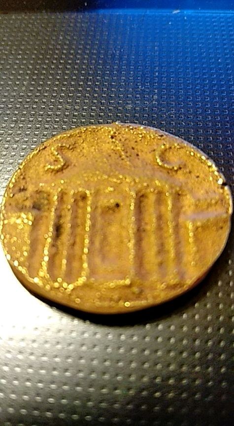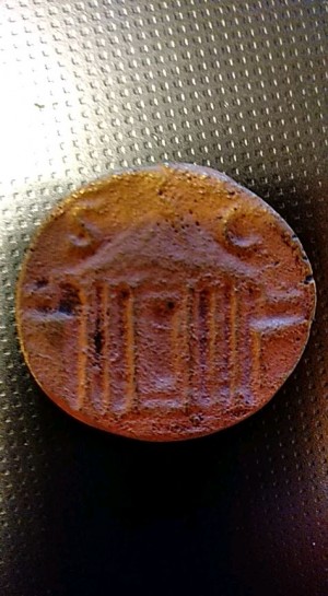 РЕВЕРС:	Фронтальный вид храма, изображенного шестиколонным, с пустой нишей в центре, на подиуме из трех ступеней. У него куполообразная крыша с отвертием вверху. Перед зданием, слева и справа, каменные пьедесталы; на правом — ягненок, на левом — теленок, обращенные друг к другу.