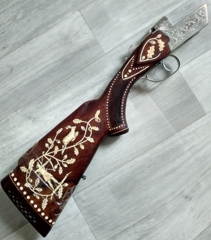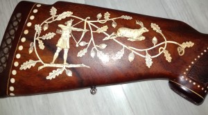 приклад ружья инкрустированный бивнем мамонта, сцены с богиней охоты Дианой и головой кабана с желудями, ручная инкрустация бивнем мамонта