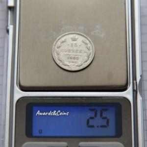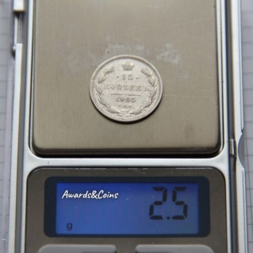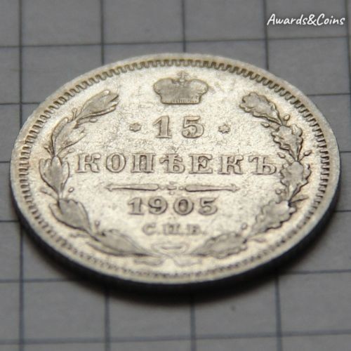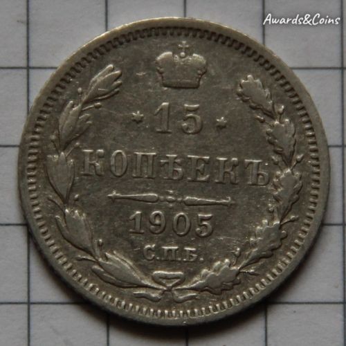Реверс: В центре указан номинал «15», ограниченный с обеих сторон звездочками. Над цифрой – Корона Российской империи. Под цифрой номинала — слово "КОПЕЕК". Ниже, расположен декоративный разделитель в виде двух разнонаправленных фигурных линий и стилизованным из точек крестом между ними. Под разделителем — дата выпуска монеты «1905». Под цифрой даты — обозначение монетного двора «С.П.Б.». Вдоль канта, не доходя до короны, изображен венок из лавровой и дубовой ветви, которые в нижней части перевязаны лентой на узел бантом. По окружности канта имеются рельефные элементы, выполненные в виде зубцов.