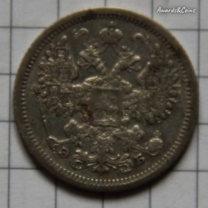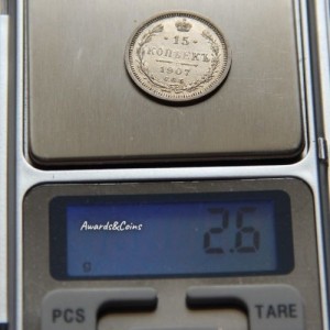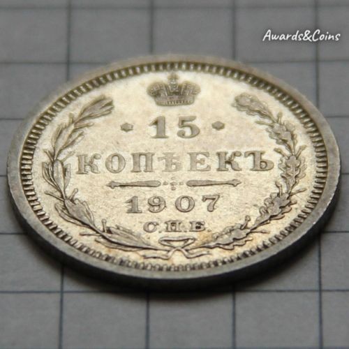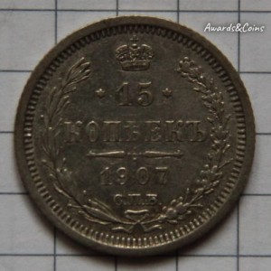 Реверс: В центре указан номинал «15», ограниченный с обеих сторон звездочками. Над цифрой – Корона Российской империи. Под цифрой номинала — слово "КОПЕЕК". Ниже, расположен декоративный разделитель в виде двух разнонаправленных фигурных линий и стилизованным из точек крестом между ними. Под разделителем — дата выпуска монеты «1907». Под цифрой даты — обозначение монетного двора «С.П.Б.». Вдоль канта, не доходя до короны, изображен венок из лавровой и дубовой ветви, которые в нижней части перевязаны лентой на узел бантом. По окружности канта имеются рельефные элементы, выполненные в виде зубцов.