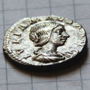 Аверс: IVLIA MAESA AVG Бюст Юлии Мезы, вправо; волосы завиты в вертикальные пряди, завязаны в косу и небольшой узел на затылке.