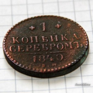 Реверс: В центре надпись в две строки: «КОП?ЙКА»?«СЕРЕБРОМЪ». Над надписью обозначение номинала — цифра «1», ограниченная с обеих сторон цветочными розетками. Под надписью расположен декоративный разделитель в виде двух фигурных линий и небольшим прямоугольным ромбом между ними. Под разделителем — год выпуска монеты «1840.». Ниже, обозначение монетного двора — буквы «Е.М.». По окружности канта имеются рельефные элементы, выполненные в виде точек.