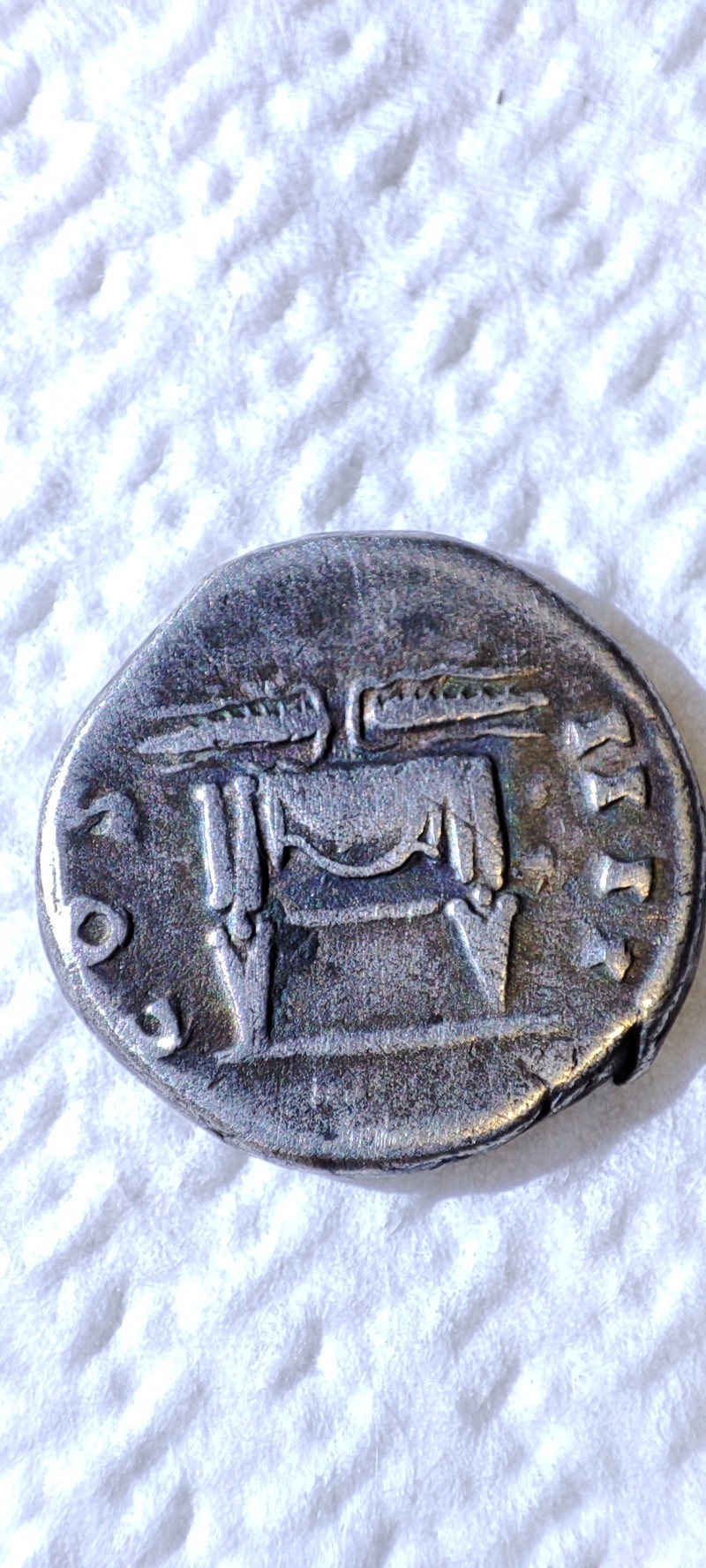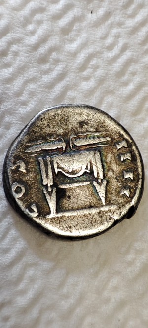 COS. IIII — крылатый пучок молний лежит горизонтально на драпированном троне (или пулвинар Юпитера и Юноны? — RIC).
